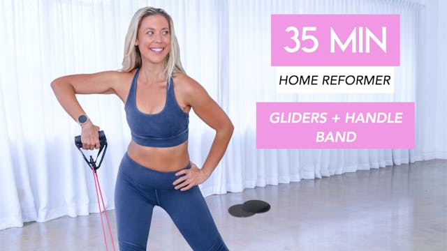 This DIY reformer class uses the gliding discs and handle band to replicate the workout you get from a pilates reformer. You are going to LOVE the slow and controlled movements in this class which help to lengthen and tone all your major muscle groups.